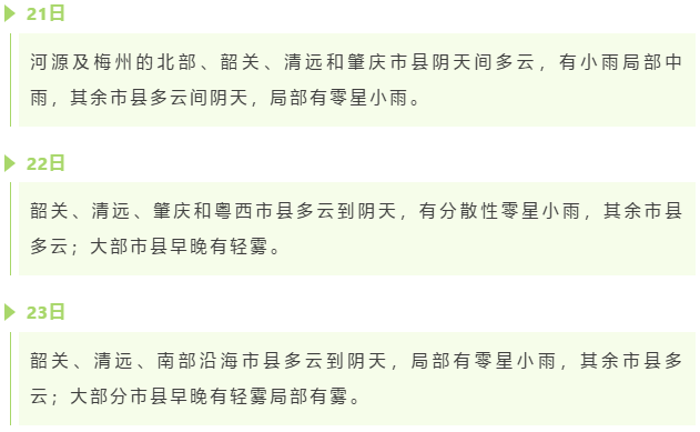 预计,20-21日粤北和珠江三角洲北部市县阴天间多云有小雨,其中,韶关及清远的南部、肇庆、河源北部市县局部有中雨或大雨;22-23日大部市县可见阳光,早晚有轻雾局部有雾。